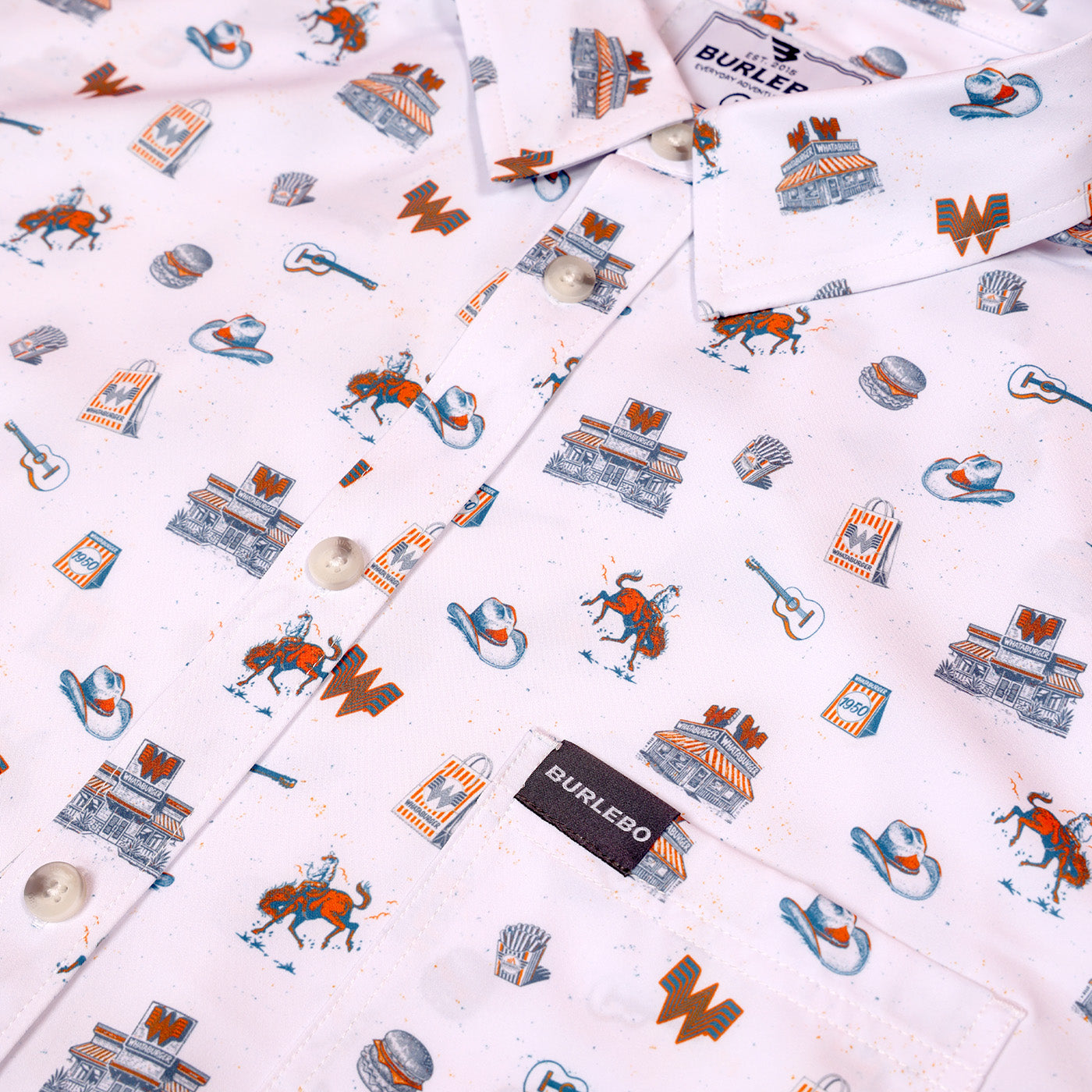 Our Limited Edition BURLEBO x WHATABURGER COLLECTION. Constructed from a lightweight performance fabric, our Performance Button Up is designed to keep you cool and comfortable all day long. The breathable, quick-dry, and moisture-wicking properties ensure you stay dry and fresh, while the four-way stretch fabric provides maximum flexibility and mobility.