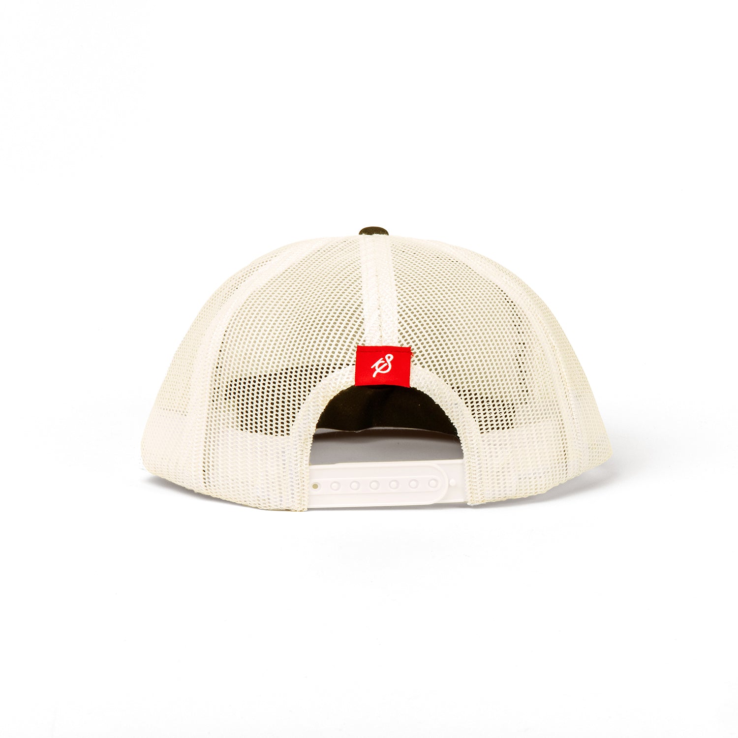 – Color: Cream Foam Front with Light Blue and Gold top bill and black rope detail