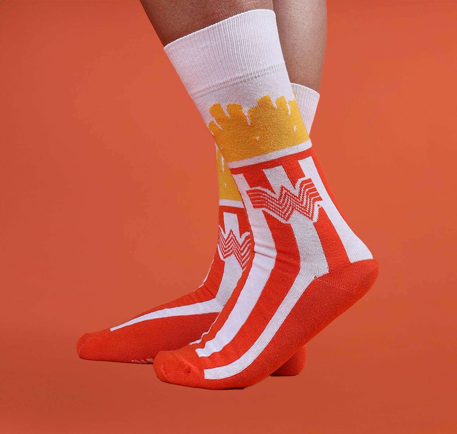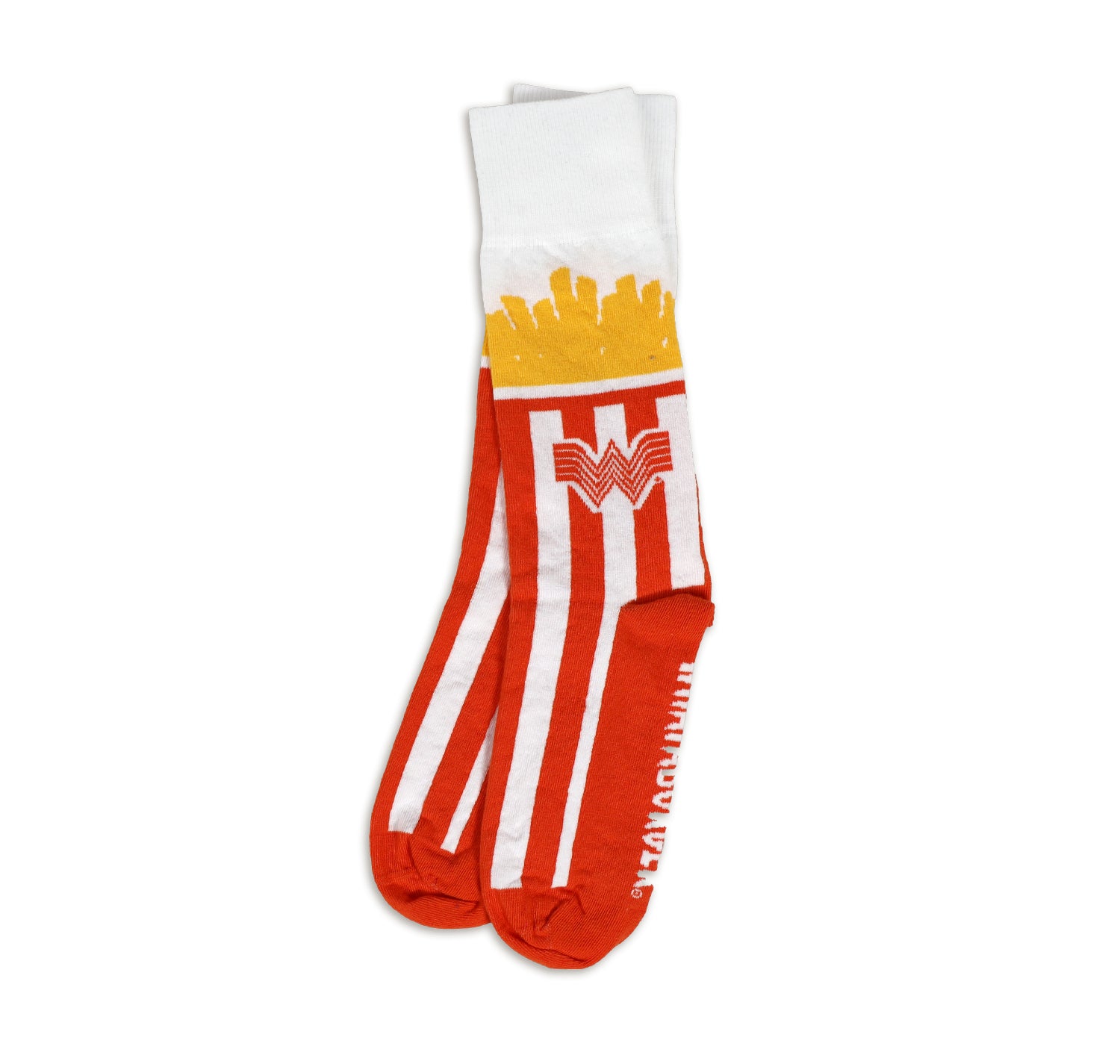 The perfect gift for the ultimate fry fanatic!These playful socks mimic the iconic Whataburger fry box, with orange and white stripes and even showcase the actual fries on the ankle. Show off your love for Whataburger in a fun and unique way.