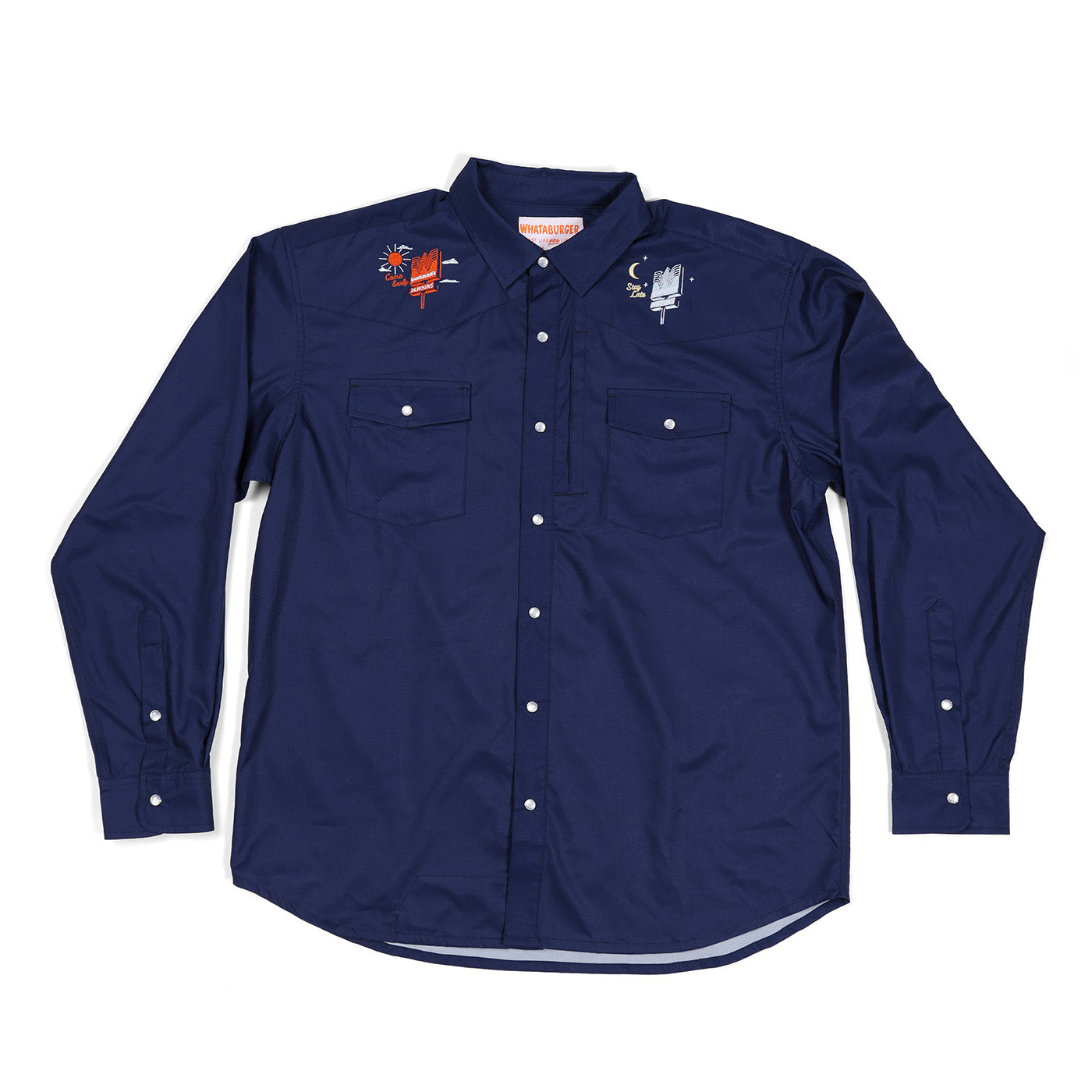 This navy long sleeve button-up shirt features unique designs on each shoulder: “Come Early” with a sunny Whataburger sign on one side, and “Stay Late” with a moonlit Whataburger sign on the other. It’s a playful way to celebrate your Whataburger love from dawn till dusk while staying comfortably stylish.