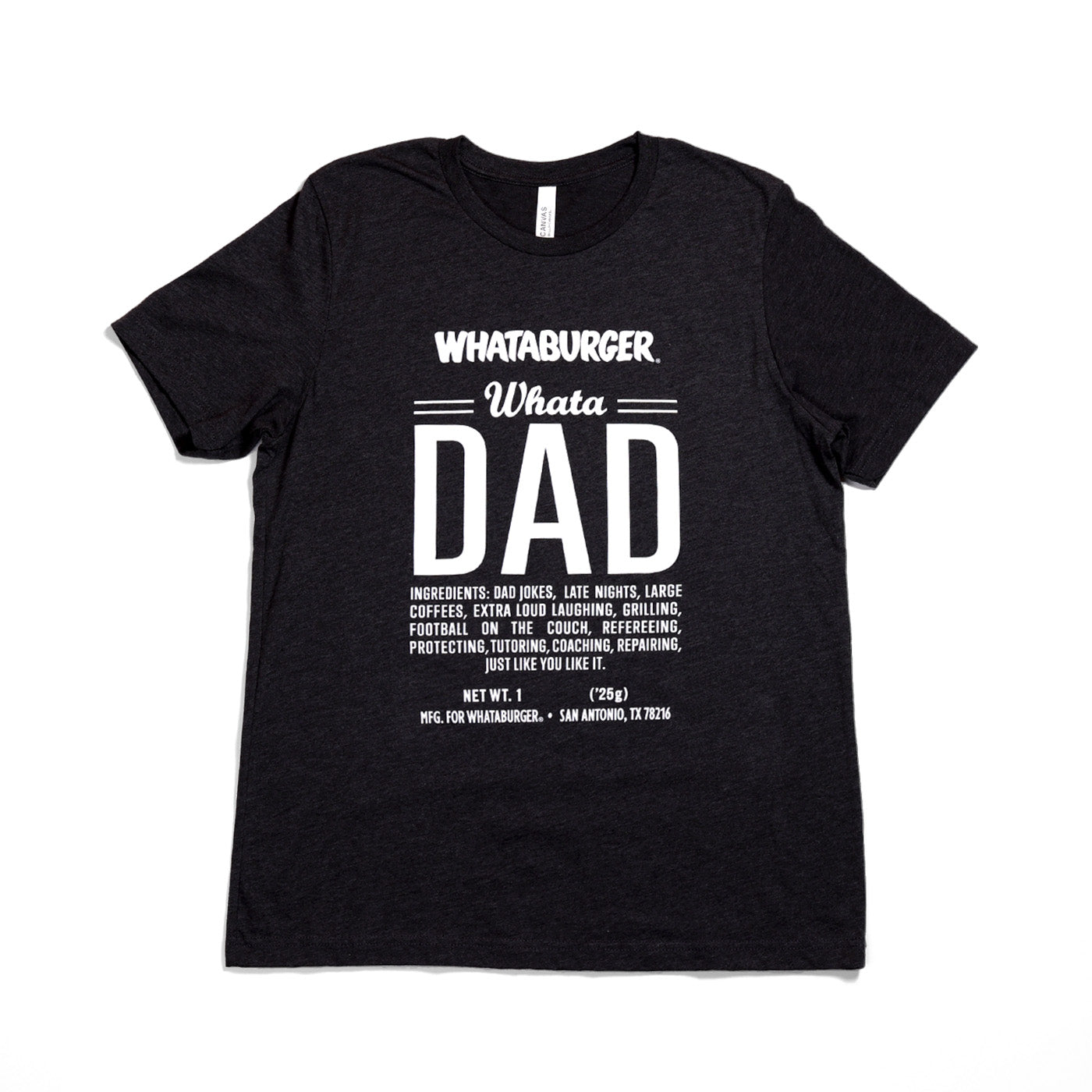 Get your dad the perfect gift with our WhataDad Ingredient Tee! Inspired by the iconic Whataburger spicy ketchup label, this tee is a playful nod to all the ingredients that make a great dad – like grilling skills to football on the couch to always protecting his family. Surprise your dad with this quirky and fun tee!