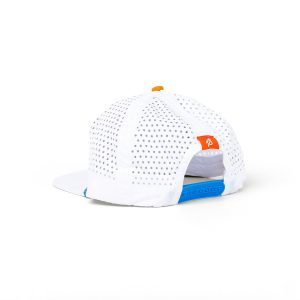 Add a touch of class with this white hat featuring a light blue and gold striped rope detail. You will stand out with the perforated hole backing and stylish front embroidery. Show off your style with the White 1950 Staunch Collection Hat.