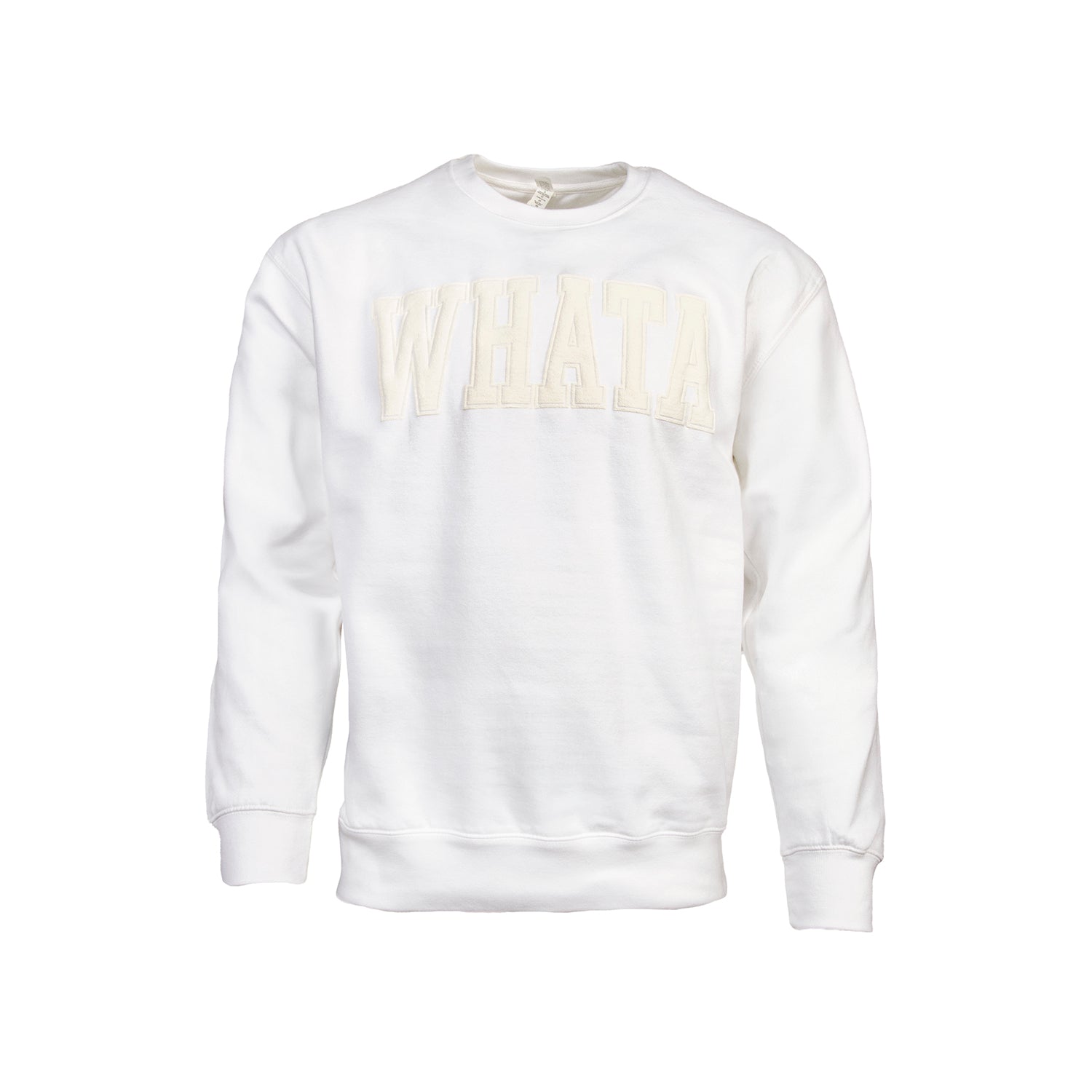 Introducing the White Whata Crewneck, a stylish and playful addition to your wardrobe. Made from soft white fabric, this crewneck features a subtle tone on tone puff print and the iconic Whata in a classic font. Perfect for any casual occasion, express your love for Whataburger in a fun and fashionable way.