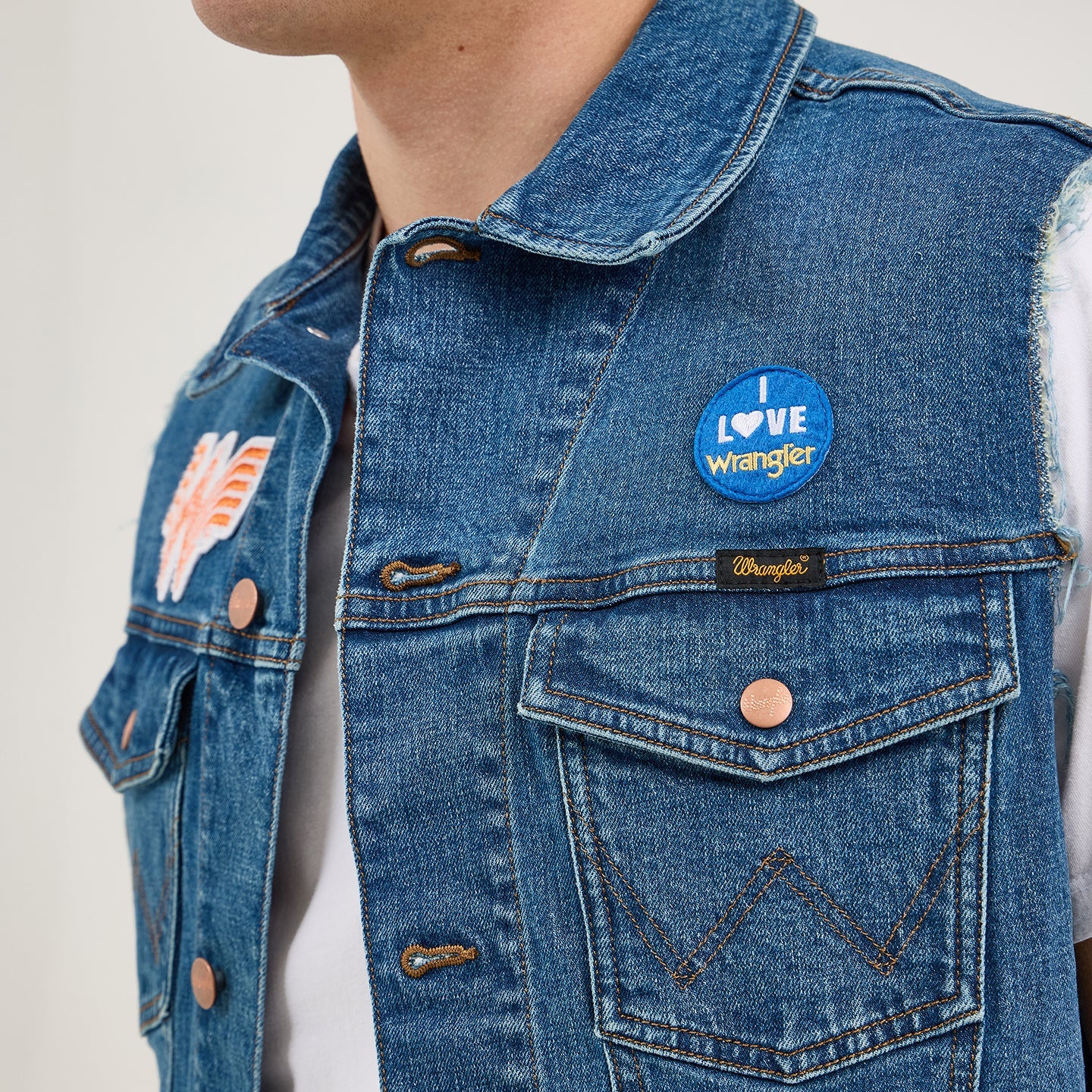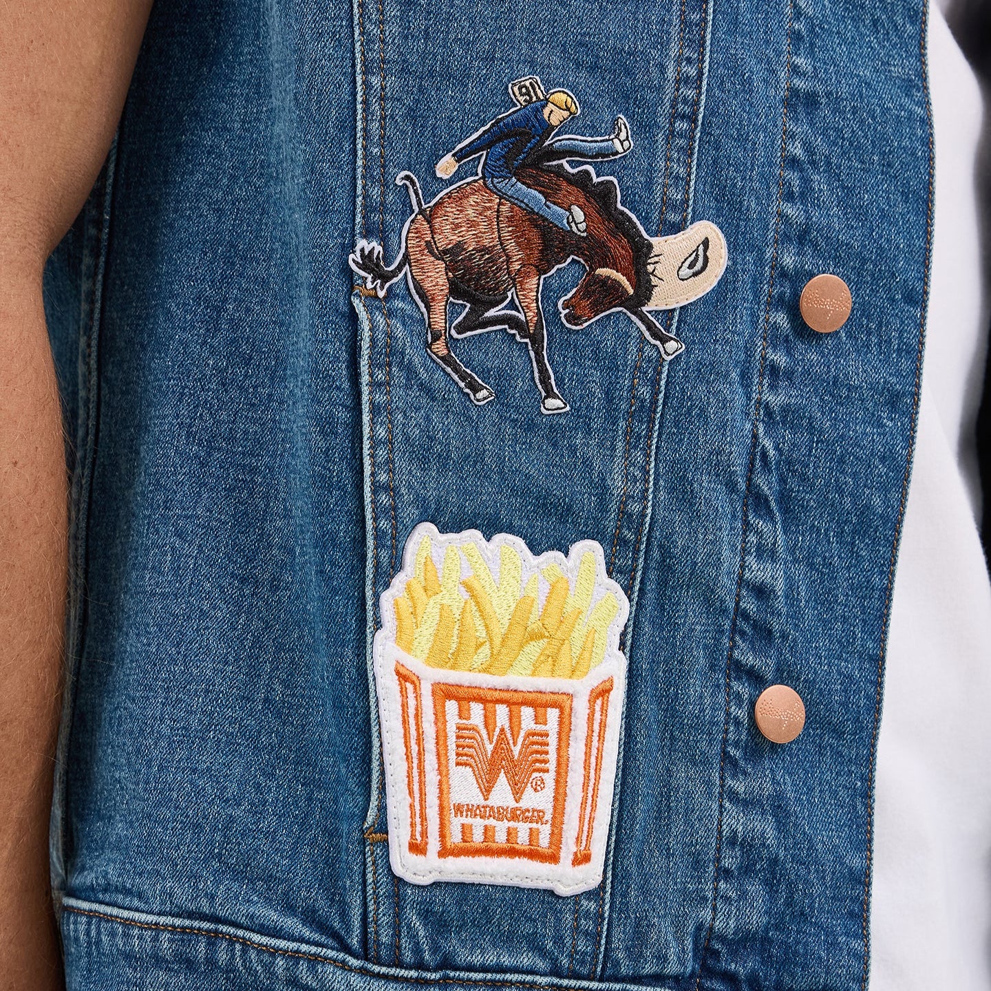 What’s better than a combo? Easy, a Texas-sized collaboration. The Wrangler® x Whataburger® Cut-Off Vest offers a fresh denim look right off the grill with all the fixings of your favorite food spot. Not too tight or too loose, it comes with a regular fit that’s great for layering. It also has the signature chest pockets with our ‘W’ stitching, bright copper hardware, and an assortment of retro-inspired patches nodding to the rich history of each brand.